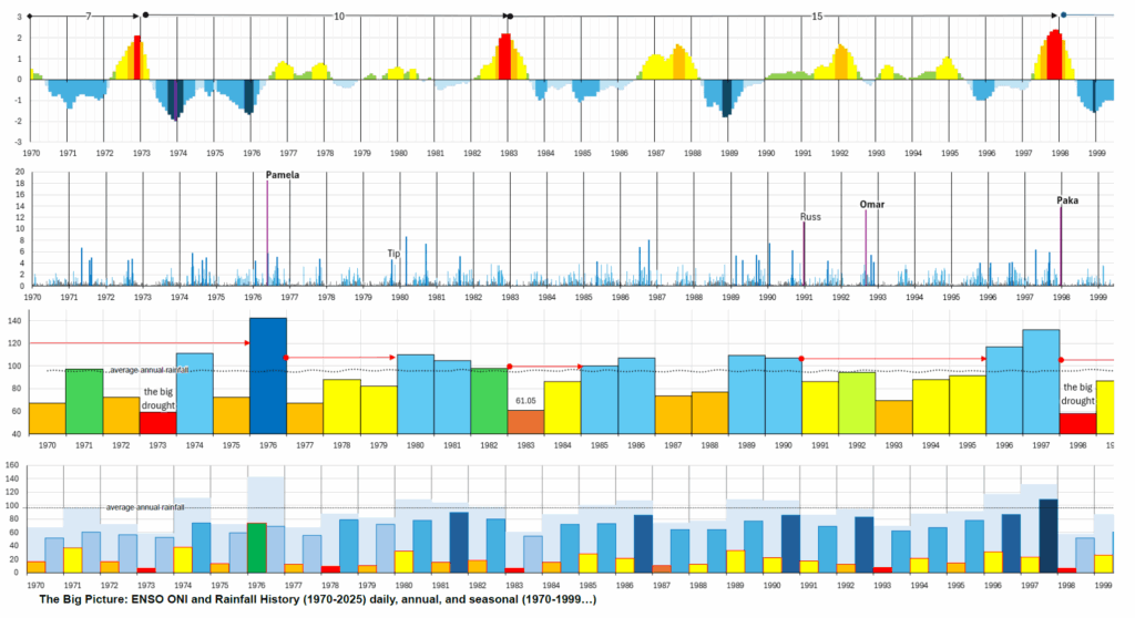 WERI GHS Program (Habana) compiles a multi-graph history of ENSO and rainfall, providing a valuable resource for hydrologic studies over 55 years. Spanning two large pages, the visualization covers the period from 1970 through October 10, 2025. The graph’s structure is organized by year, marked by major vertical gridlines, and further delineated into quarters by minor gridlines. The top panel plots the Oceanic Niño Index (ONI), sourced from the NOAA NWS Climate Prediction Center, illustrating positive (El Niño) and negative (La Niña) values.