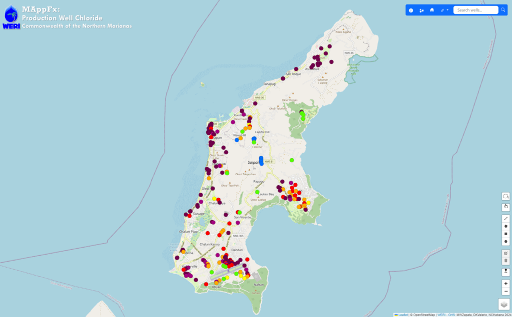 Two MAppFx products were created for Saipan, CNMI using the production well nitrates and chloride data, respectively. The WERI GHS IM team developed a system to organize the raw data, an Excel file, and convert it into a JSON file as an input into the MAppFx interface. The map features an interactive map of Saipan with production wells as the points of survey. Each well is color coded based on a system of values provided by the Saipan BECQ team and can be toggled on and off through the map’s legend and layer control widget. Its graphs display available data for the site that users can also interact with.