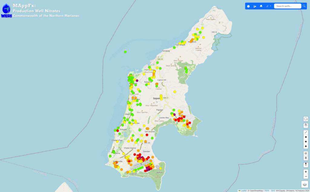 Many water resource researchers and agencies have longed for an interactive database map that is easy to access, especially in discussions and decisions for water source protection and production management. Web development tools, namely JavaScript libraries and frameworks, offer a rife range of resources to create interactive map and graph platforms. With the availability of these tools, the WERI GHS IM team can pursue avenues for online hydrologic databases. This led the team to develop data visualization interface that features a map of survey points, or areas within polygons or polyline boundaries, with historic data. To store the map’s geographic metadata and data for the plot, a JSON (JavaScript Object Notation) file was used. As a result, the first data visualization product in the MAppFx series, which features an interactive map of Guam’s production wells and nitrate data, which was based on a WERI research by J. Bulaklak and N.C. Habana (2021). Users can interact with the map through layer toggles, drawing tools for highlighting select areas or presentation purposes, and information panels detailing statistical analysis and time series plots of available nitrate data.