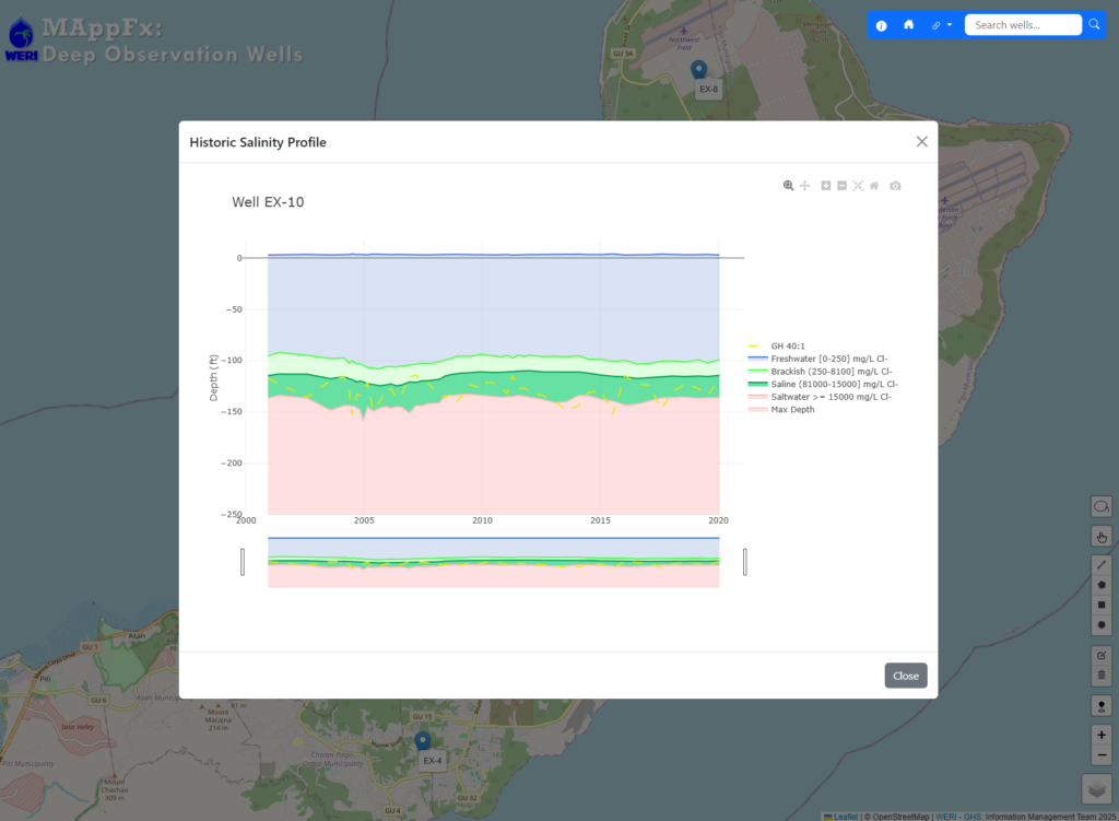 Deep observation wells (DOWs) are phreatic access ports for conducting salinity profiles in the NGLA. A DOW is a vertically positioned tubular structure that extends down a borehole with perforation below the saturated zone, penetrating the freshwater lens, extending into the saltwater zone. This allows for a depth and conductivity analysis that translates into a salinity profile. The salinity profile sampling is done at least twice a year. This operation was conducted as part of the WERI-USGS data collection under the CWMP. Dougher et al. (2019, WTR 168) developed the first historic graphing of salinity profiles for three DOWs in the Tomhom Aquifer, NGLA. The report defines the phreatic zone of freshwater, transition zone, and saltwater. Dougher’s research revealed the capacity and durability of the aquifer that went through a major recharge event from typhoons, followed by a 6-year drought. In 2024, the WERI GHS IM team started developing the historic graph of phreatic zone for the DOWs as a component of the MAppFx web app. On the MAppFx interface, users see 8 DOW historic profiles that began in 2001. In the future, it will include the newly installed DOWs of both GWA and Military. The WERI GHS IM team was able to create a workflow that converts the raw Excel data to MAppFx’s input and database file, JSON. This system is easy to manage and update when new data is received. DOW salinity profiles alone are difficult to analyze and present in such a way that could be well understood. Historic salinity profiles provide a better and valuable insight for determining the status of the aquifer, showing changes in freshwater lens thickness in response to drought and ample recharge. MAppFx makes this easier to visualize and support with the management of the island’s major water resource.