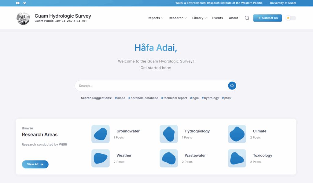 WERI serves numerous island agency partners through the GHS Program, attending legislative hearings, providing research findings, sharing hydrologic and geologic maps, and advising on water resource concerns. Through the GHS Program, reliable research-based information can be achieved. Therefore, the Guam Legislature, Guam Environmental Protection Agency (GEPA), Guam Waterworks Authority (GWA), NAVFAC Marianas, and the Groundwater Resources Development Group (GWRDG) are more confident in determining management plans, actions, and regulations involving our water resources. WERI shared water research findings and advised agencies on wastewater issues, aquifer capacity, hydrogeologic assessments, surface hydrology, saltwater intrusion, and the new online data visualization products.