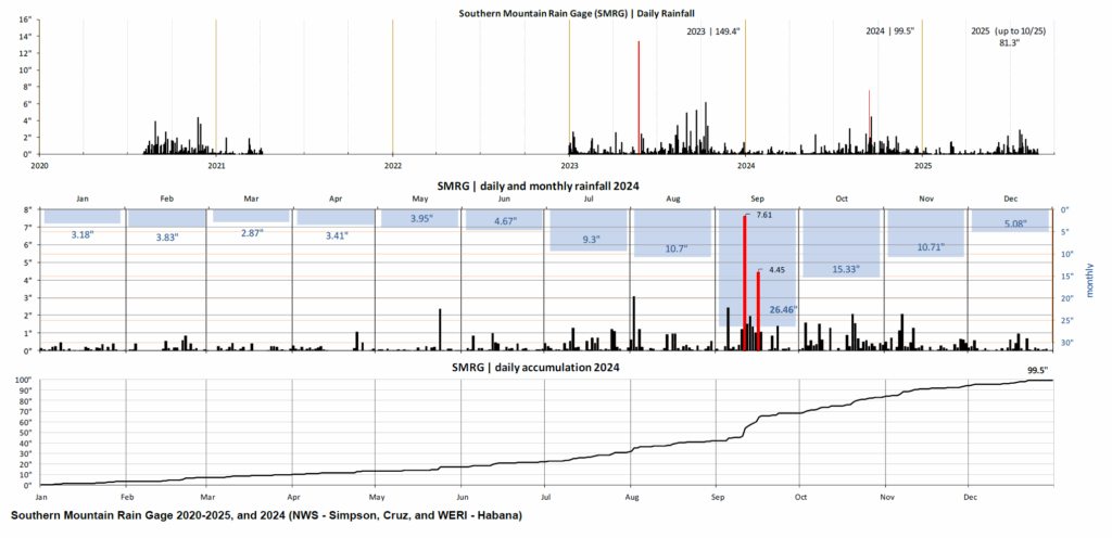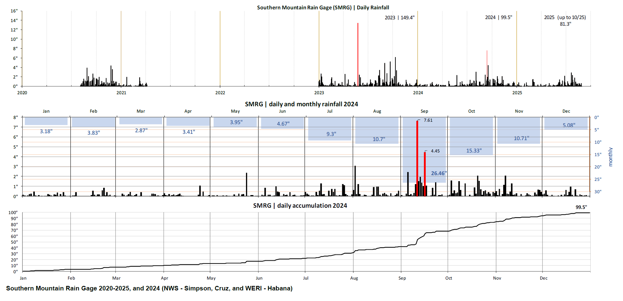 NWS field team of Simpson and Cruz continue a monthly trek to the late Dr. Lander rain gage at the top of the Humåtac Watershed, called the Southern Mountain Rain Gage (SMRG). Habana processes the rain data for analysis. In 2023, the year of Typhoon Mawar, the SMRG logged more than 149 inches of rainfall, which may be one of the highest annual recorded rainfalls in Guam (see graph, next 2 pages). The following year had about a 100” of annual rainfall. In 2025, up to October 25, the SMRG total was 81 in. In 2024, the highest monthly rainfall recorded was 26.5 in, in September. That month had two daily rainfalls greater than 4 in (red bars).