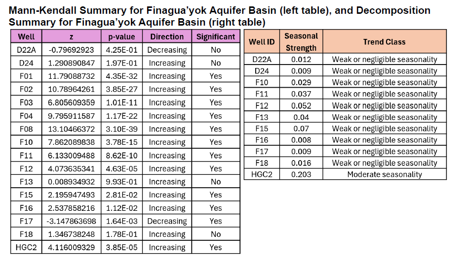 This project presents an updated assessment of chloride concentration trends and production patterns in the Finagua’yok, Tomhom, Hagåtña, and Mangilao Basins, building upon the findings of four previous technical reports. The primary objective is to provide a consistent, basin-scale evaluation of recent data, highlighting changes over the past decade and ongoing patterns in groundwater quality and well production. The analysis integrates updated decadal statistics, spatial mapping of chloride trends, updated statistical analysis (Mann-Kendall and STL decomposition), and evaluation of pumping practices relative to Northern Guam Lens Study (NGLS) recommendations. By comparing the most recent decade with the preceding decade, this research identifies wells that have maintained stable conditions as well as those indicating changes in chloride concentrations or production rates. Summary tables and maps are used to support these assessments, providing a clear view of temporal and spatial patterns that may inform water management decisions. The Mann-Kendall and STL Decomposition results for Finagua’yok Basin are shown in Tables 1 and 2. The updated evaluation is intended to serve as a reference for ongoing monitoring, management planning, and decision-making in the Northern Guam Lens Aquifer, complementing the prior reports while emphasizing recent trends and emerging areas of concern.