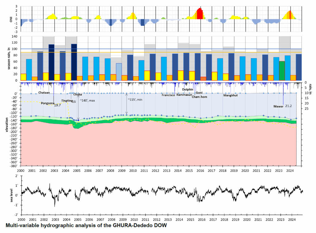 This study analyzes how rainfall, tides, and climate phenomena such as El Niño and La Niña influence freshwater lens thickness. Multi-variable hydrographic analyses integrate the Oceanic Niño Index (ONI), rainfall, sea level, and DOW historic salinity profile data to illustrate the aquifer’s response to climatic and hydrologic conditions. At the GHURA-Dededo DOW, for example, lens thickness fluctuates with drought and recharge periods, including major typhoon rainfall events such as Pongsona (2002), Dolphin (2015), Mangkhut (2018), and Mawar (2023).